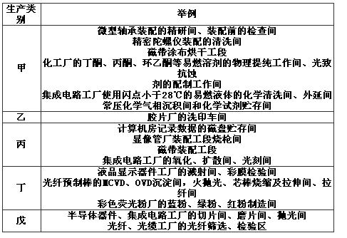 表B 潔凈廠房生產工作間的火災危險性分類舉例: